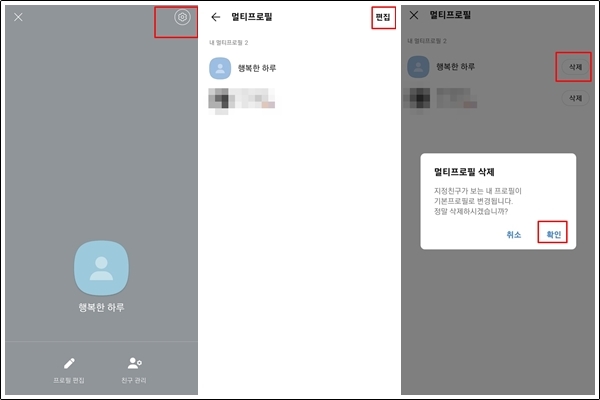 이렇게 만든 멀티 프로필 사용이 필요 없게 되었을 때 삭제하는 방법도 있습니다. 새로 만든 프로필을 누르고 오른쪽 상단에 톱니바퀴 모양의 설정을 누르면 그동안 만든 멀티 프로필이 나옵니다. 편집을 누르고 삭제하고자 하는 프로필 삭제를 누릅니다. 확인을 누르면 멀티 프로필이 사라집니다.